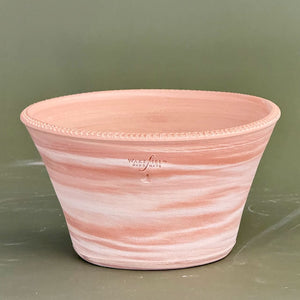 Marbled pottery, also referred to sometimes as agateware, has ancient roots, going all the way back to the Roman Empire (1st century BC to the 5th century AD). Examples of marbled ware can also be found in pottery of the Tang Dynasty in China, (618-907 AD) the Persians, (9th to 13th centuries AD) and in 18th century Europe it gained wide popularity when taken to new heights by Josiah Wedgewood. Simply put, marble ware uses a technique of combining contrasting colors of clay together, with the natural movement of each clay color creating a flowing pattern that is reminiscent of marble. There are an infinite number of patterns that can be created this way, and no two pieces will ever be exactly the same.