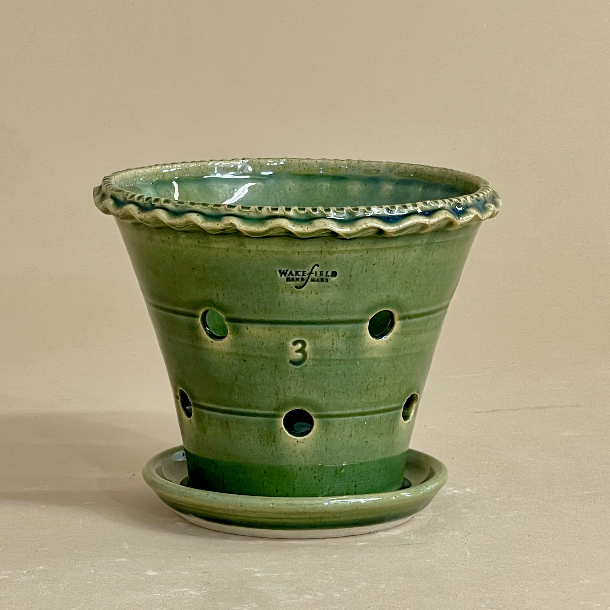 The dentil motif on this piecrusted rim is inspired by some of the flower pots made by Cornish potters who immigrated to Wisconsin in the 1840's.